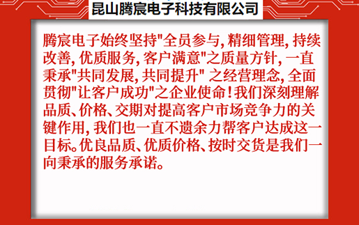 昆山騰宸電子科技有限公司位于中國線路板加工之都昆山千燈,公司專注于電路板研發(fā)設計、PCB抄板、元器件采購、SMT貼片加工、組裝測試,為客戶提供一站式電子制造服務。騰宸電子始終堅持"全員參與,精細管理,持續(xù)改善,優(yōu)質服務,客戶滿意"之質量方針,一直秉承"共同發(fā)展,共同提升" 之經營理念,全面貫徹"讓客戶成功"之企業(yè)使命!我們深刻理解品質、價格、交期對提高客戶市場競爭力的關鍵作用,我們也一直不遺余力幫客戶達成這一目標。優(yōu)良品質、優(yōu)質價格、按時交貨是我們一向秉承的服務承諾。 ...